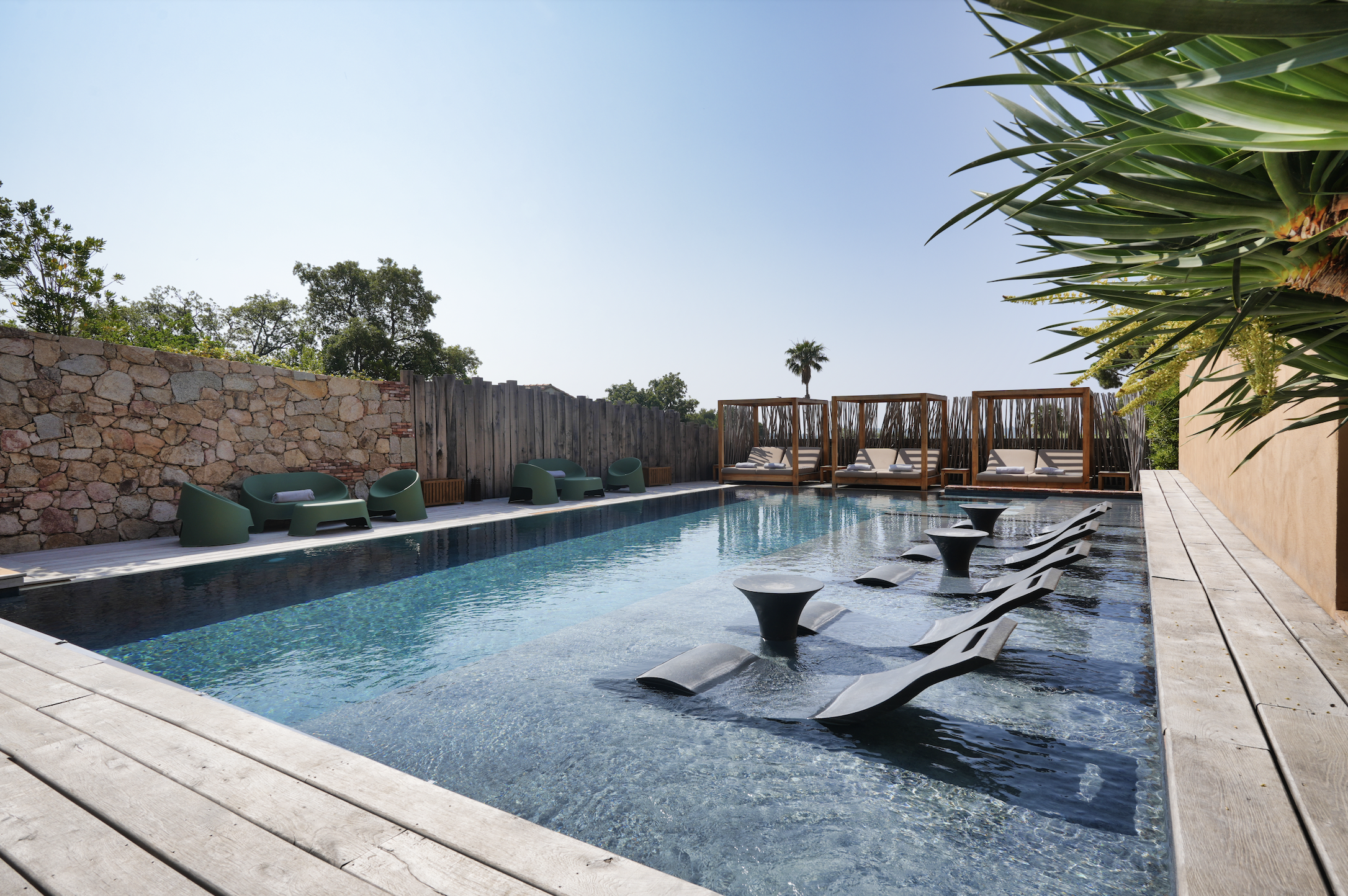 Les Regalia combines the standards of a 5-star hotel with the atmosphere of a family-run property. It reflects both the character of Corsica and a more contemporary approach to hospitality. Located in Pinarello, it offers a peaceful setting with a heated infinity pool and easy access to the beach, where sunbeds can also be reserved on the hotel’s private area.